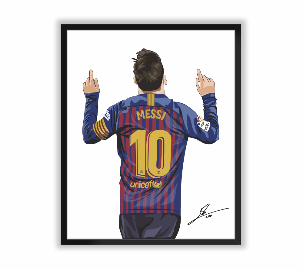 لوحة جدارية مميزة تُجسد لحظة تاريخية للأسطورة ميسي وهو يحتفل على أرض ملعب كامب نو. اللوحة تُظهر القميص الشهير رقم 10 الذي حمله ميسي مع برشلونة، مصممة بشكل أنيق وبتفاصيل دقيقة.